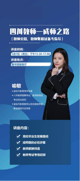 5月7日下午,人文与设计学院、图书与档案信息中心在图书馆报告厅成功联合主办“贵州教师—成师之路”活动。活动特邀金标尺教育资深专家喻敏,现场讲授了教师公招、备考教师资格证等内容,全校200多名同学参加。